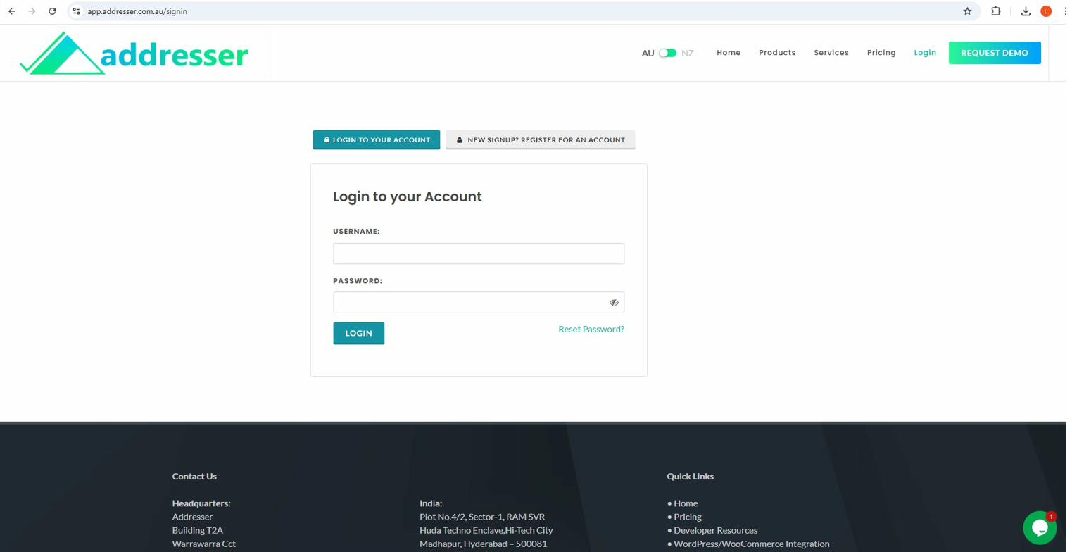 Go to app.addresser.org/signin. Enter your username and password then click LOGIN. Use Reset Password if you have forgotten your credentials.