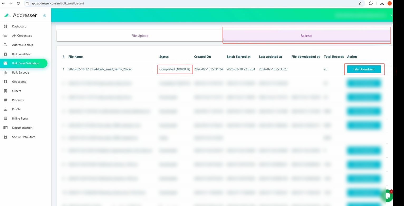 Click the teal File Download button on the right of the completed row. Your browser will download a CSV prefixed with the batch timestamp (e.g. 2026-02-18 22:31:24-bulk_email_verify_20.csv).