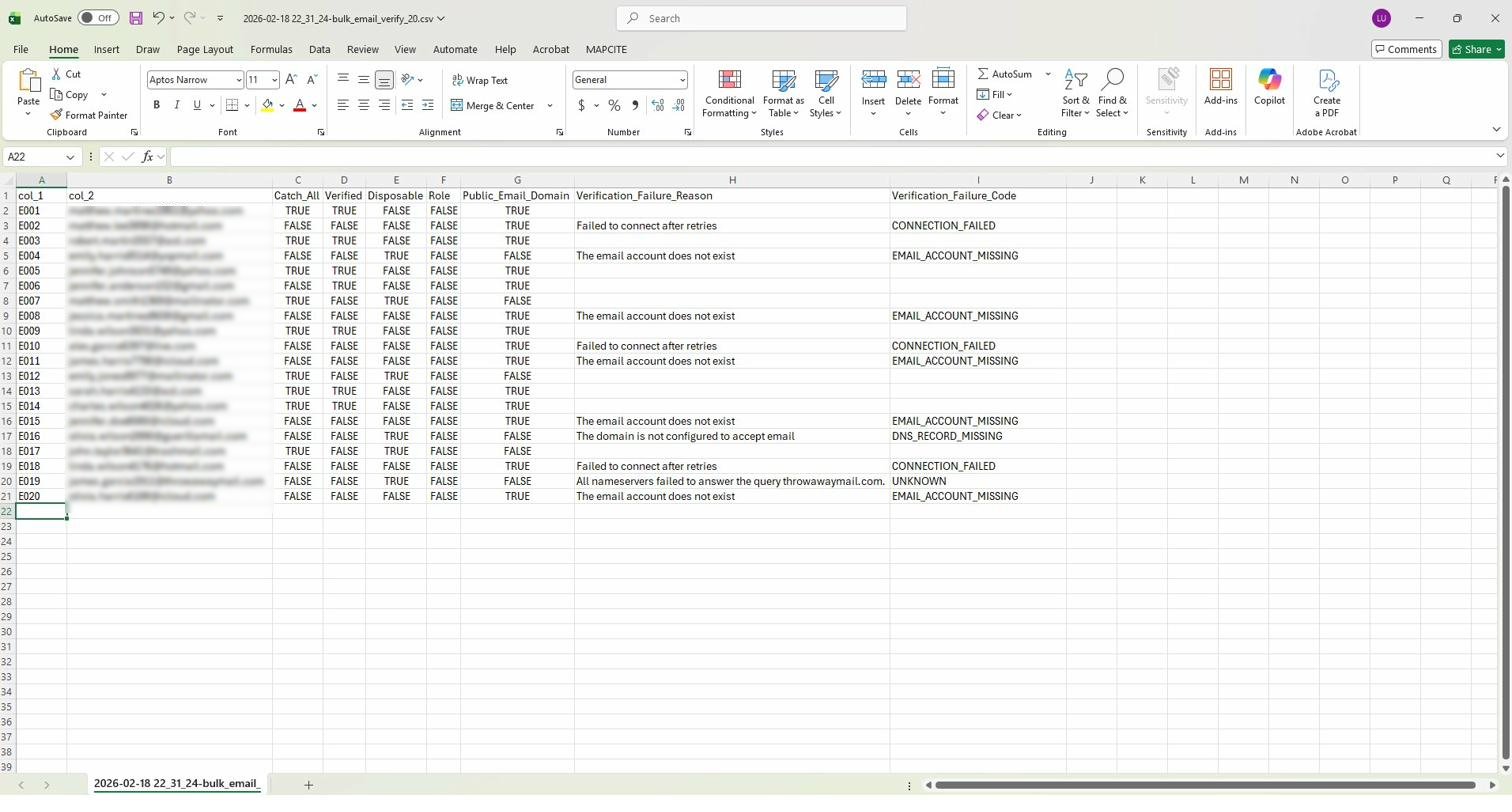 | Verification_Failure_Reason | Text / Blank | Human-readable explanation of why verification failed. Blank when Verified = TRUE. Examples: "The email account does not exist", "Failed to connect after retries", "The domain is not configured to accept email". |