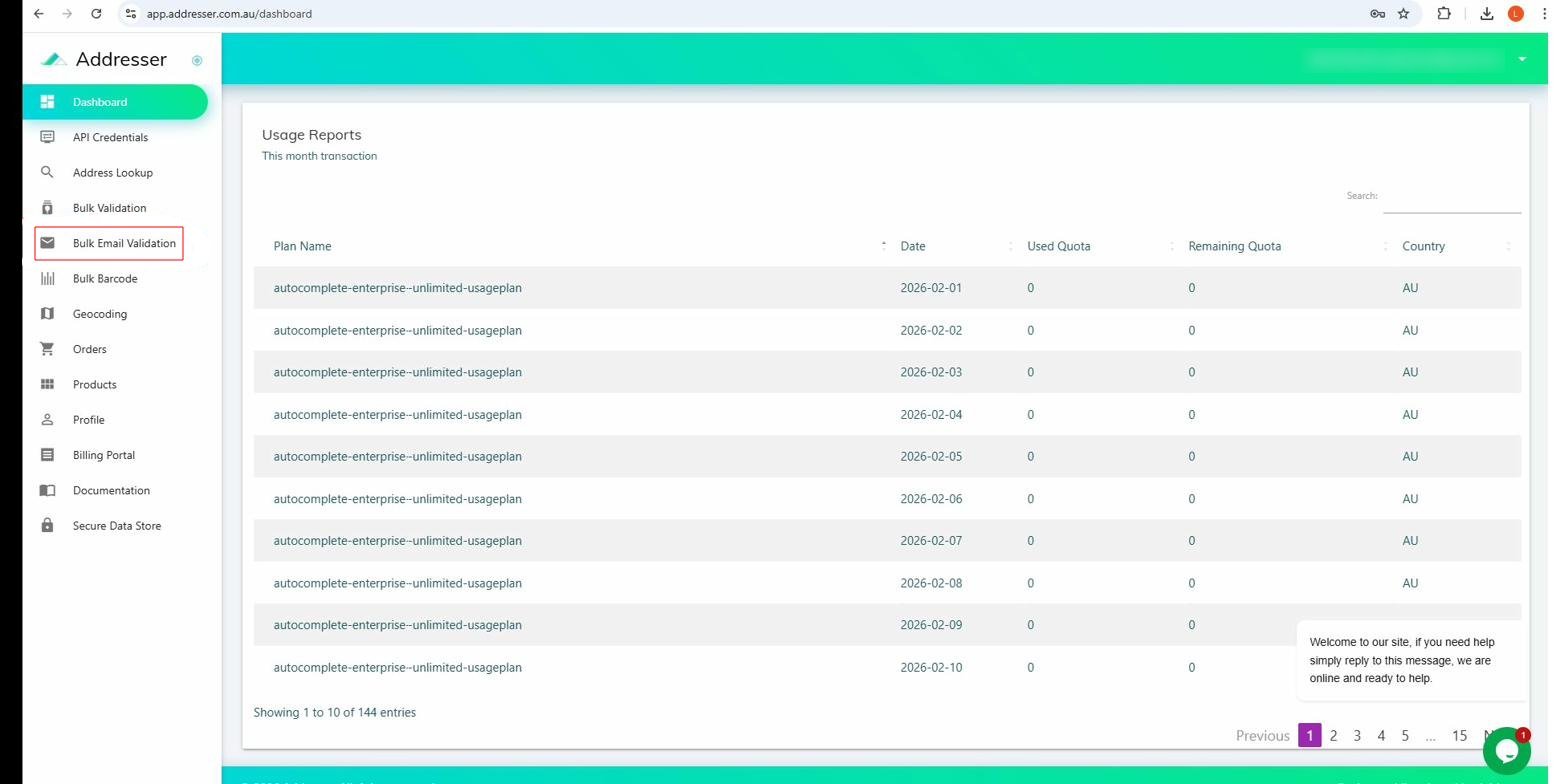 After logging in you land on the Dashboard showing Usage Reports. In the left-hand sidebar, click Bulk Email Validation.
