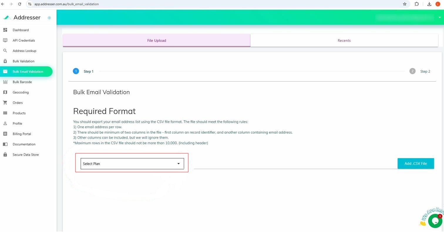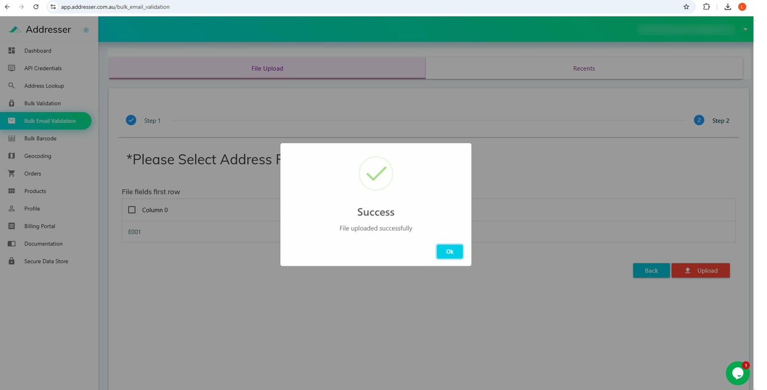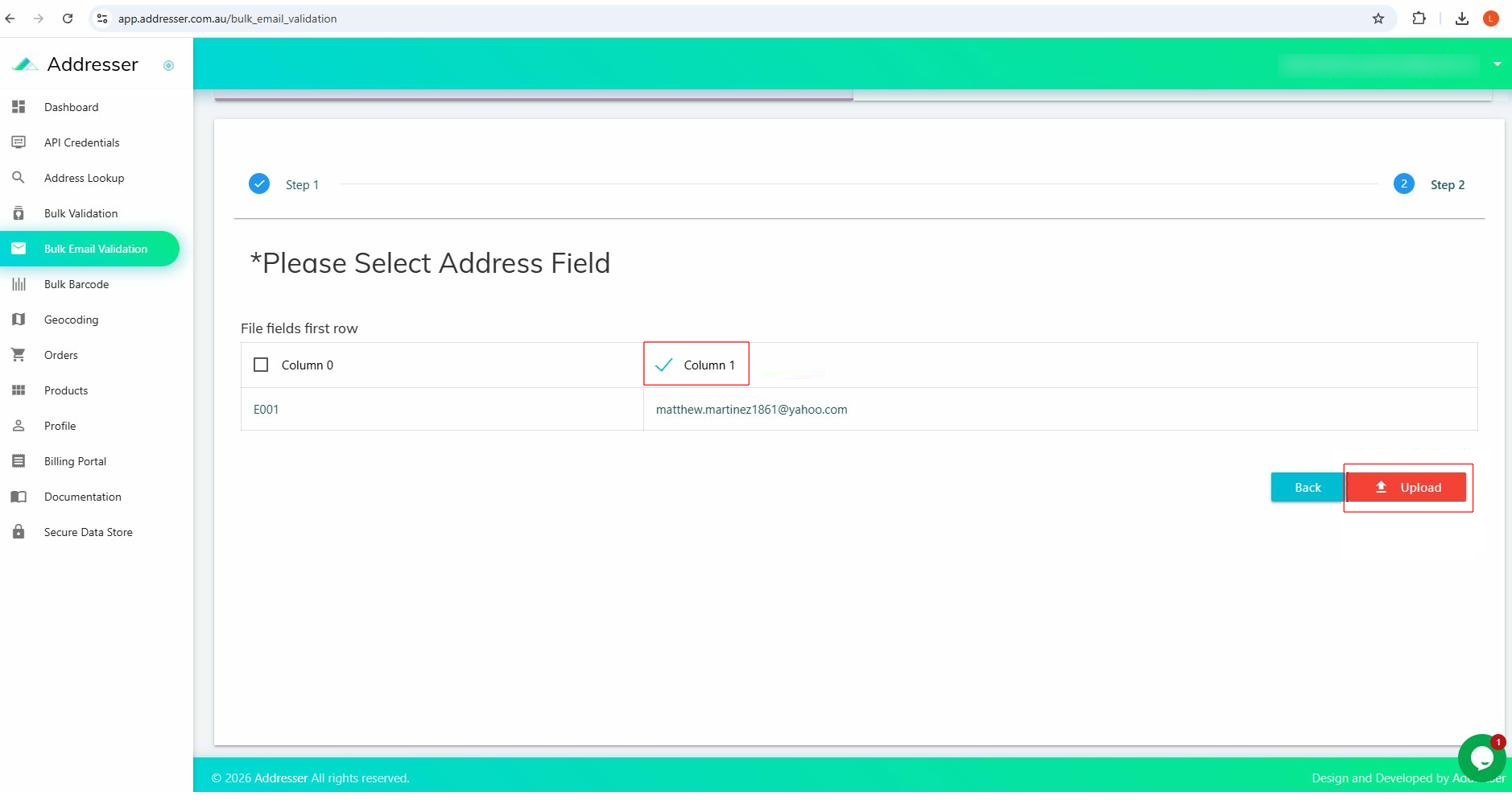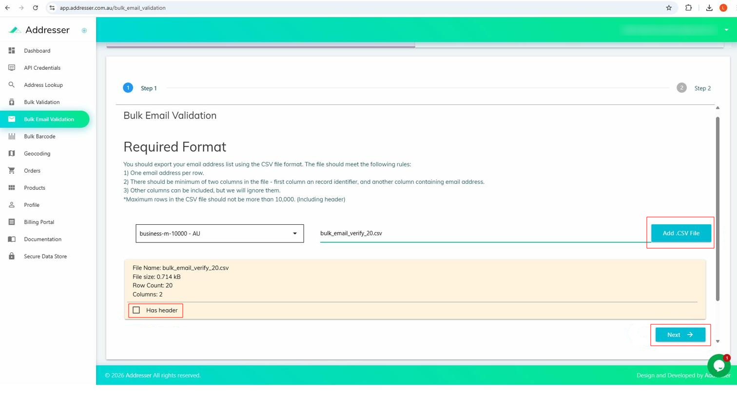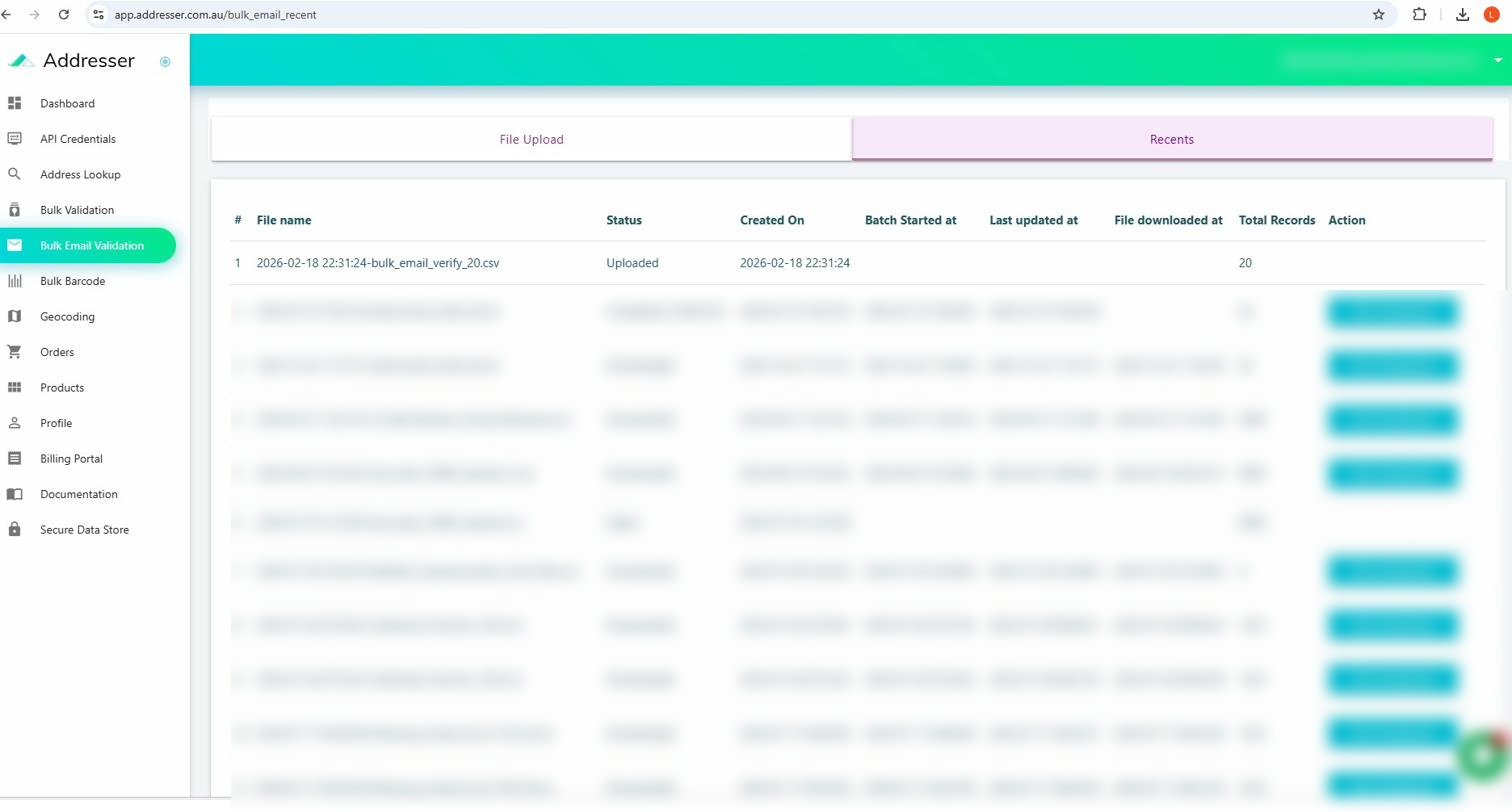Sign in at app.addresser.org/signin then click Bulk Email Validation in the sidebar.