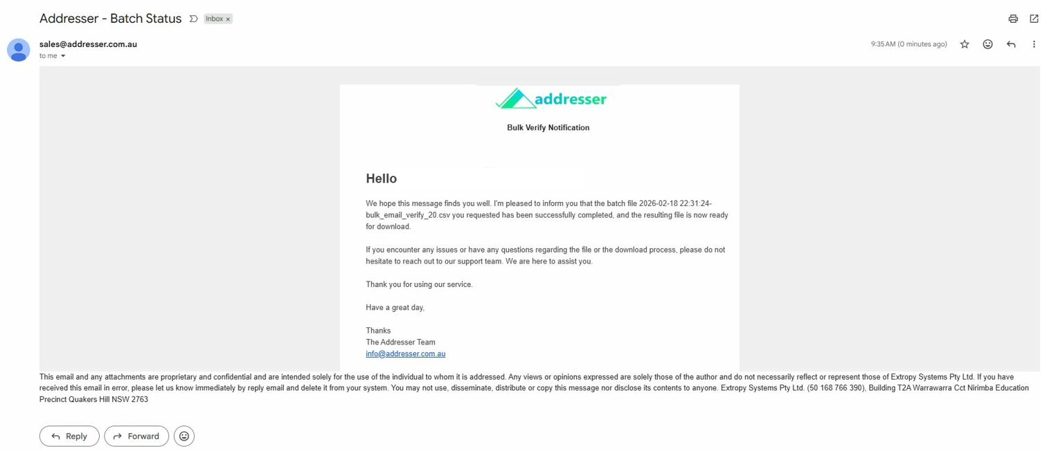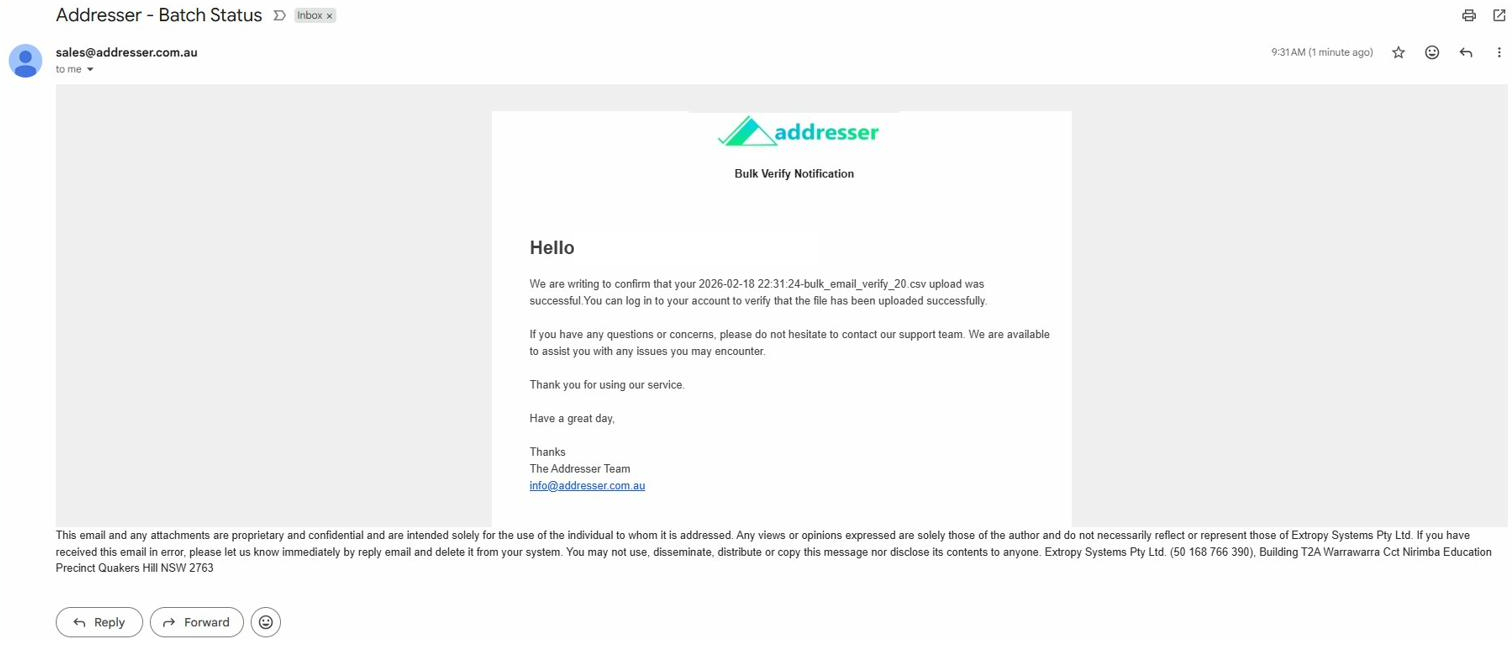 Addresser automatically sends two emails to keep you informed. Both arrive from sales@addresser.org with subject "Addresser – Batch Status".